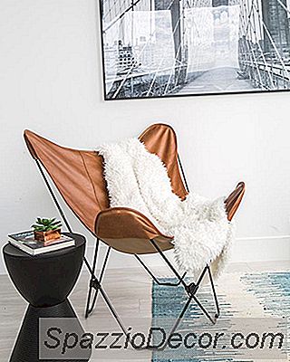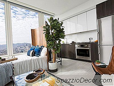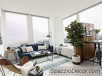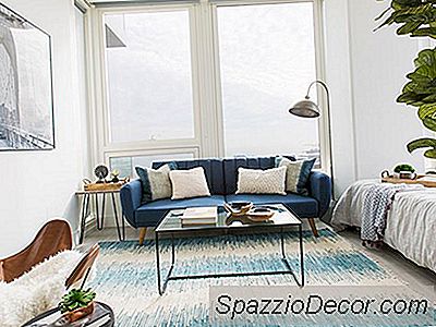 Med grensene for bare 600-kvadratfot og et $ 2,500-budsjett å jobbe med, utformet Laurel & Wolf-designer Erica Johnston en genial plan for å dele det åpne konseptets gulvplan i tre forskjellige seksjoner. For å gjøre det, implementerte Erica mesterlig en treverk, slatted skjerm romdeler, og skapte et soverom mellom stue og kjøkken. Romdeleren tjener også som hodegjerde for sengen på den ene siden og et kunstverk på den andre siden som vender mot kjøkkenet. Mens oppholdsrommet støter opp mot dette nye make-shift-soverommet, gjør Ericas plassering av sofaen og det store området teppet seg til å føle seg som separate rom.